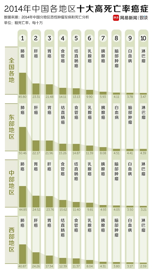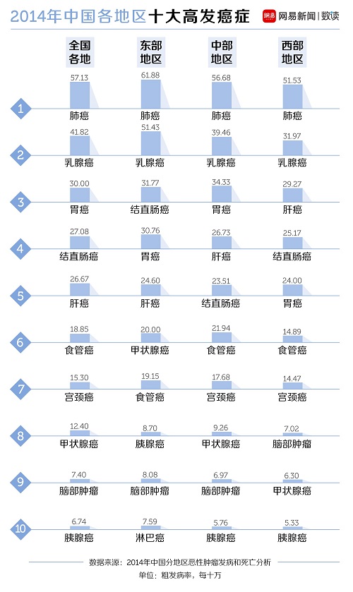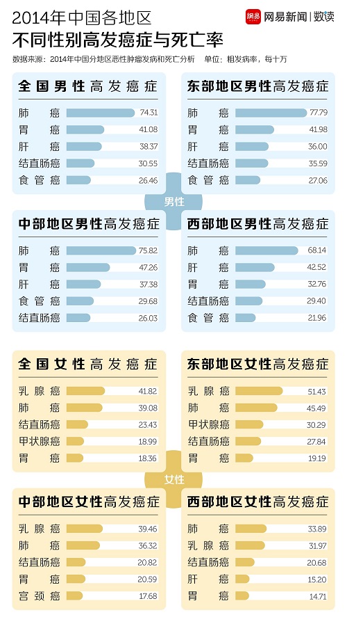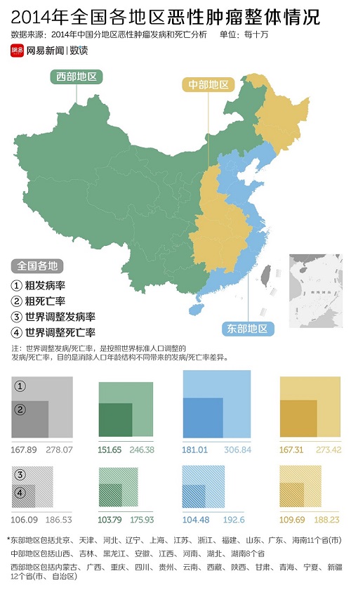 尽管国家癌症中心发布的登记资料没有提供具体的省际数据,但是依然可以看到东部地区、中部地区和西部地区在癌症发病率和死亡率上的差异。