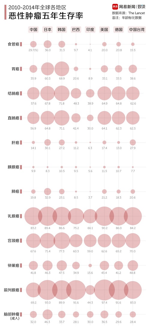 发病率最高的肺癌,五年生存率最高的日本也只是刚刚超过30%,而中国19.8%的生存率已经足以排在世界前15。更为惨淡的是,在中国发病率位于第五位的肝癌,在中国的五年生存率仅为14.1%,甚至不足日本(30.1%)的一半。