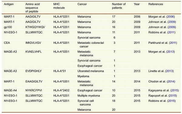采用TCR-T的过继免疫治疗已成为癌症治疗的重要策略,最近的临床试验显示出了令人鼓舞的结果(表1)。首次报道的是在2006年,MART-1 的TCR-T可以介导人类肿瘤的消退,随后,2009年和2014年MART-1 TCR-T的临床试验也证明了这一现象。Johnson等人指出,在使用gp100 TCR-T细胞治疗的患者中,有19%的患者出现过抗肿瘤反应。除了分化抗原外,进入临床试验的还有癌-睾抗原,如MAGE-A3和NY-ESO-1。在使用针对HLA-A*0201限制性NY-ESO-1抗原的TCR的临床试验中,有超过50%的滑膜肉瘤、黑色素瘤和骨髓瘤等患者被检测到有应答反应。Kageyama等人进行了一项临床试验,用针对HLA-A*2402限制性的、MAGE-A4的TCR-T检测对食管癌的治疗效果。通过检测发现,这些TCR-T细胞可以在体内维持很长一段时间,有3名患者维持最小肿瘤状态超过27个月。这些临床试验表明,TCR-T细胞治疗可使肿瘤发生明显的消退。这引起了人们巨大的热情,然而必须指出的是,大部分的临床试验只是在少数的癌症患者中进行。此外,尽管TCR-T在过继细胞治疗中取得了很大进展,但也出现了一些意想不到的毒性。在一项靶向转移性结直肠癌的TCR-T细胞临床试验中,所用的TCR对CEA有很高的亲和力,结果三名患者均因TCR对表达CEA的正常结肠上皮细胞的反应而出现严重的暂时性结肠炎(尽管有1例患者在肺和肝脏的转移癌出现了消退)。在另一项研究中,两名患者在回输TCR-T后死于心源性休克,该TCR靶向的是HLA-A*01限制性的MAGE-A3抗原。Linette等人通过在MAGE-A3 TCR的α链CDR-2区引入4个突变,β链保留用野生型序列,可以提高TCR的亲和力,这种亲和力增强的TCR可能会识别来自正常心脏组织表达的无关蛋白的表位,其野生型MAGE-A3特异性的TCR因为通过胸腺的自然选择过程,也可能在患者体内扩增而没有心脏毒性,在MAGE-A3的TCR-T治疗后,两名患者陷入昏迷,随后死亡。在该研究中,经基因改造的T细胞还识别了在人脑中被检测到的MAGE-A12的衍生表位。由于潜在的交叉反应,TCR亲和力的评估和合适抗原的选择就需要非常的谨慎,这对TCR-T的安全临床应用是非常必要的。