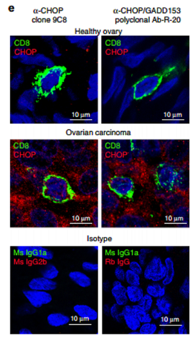 他们发现卵巢癌患者的T细胞中Chop的表达高于正常卵巢组织。他们还发现,卵巢癌患者CD8+肿瘤浸润T细胞中Chop的核水平高与临床反应差有关。这表明Chop可能参与了癌症免疫反应的改变。