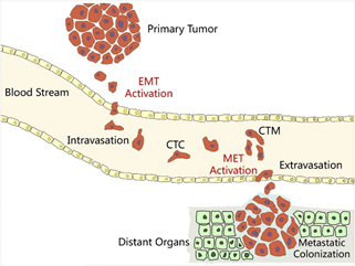 我是在实体肿瘤病灶中长大的,经历了上皮-间质转变(Epithelial Mesenchymal Transition,EMT)后获得脱离基底膜的能力,通过组织基质进入血管,利用血液和淋巴系统转运到其他组织。随外周血移走过程中我会附着血管内壁缓慢滚动,仔细寻找合适的位置。一旦发现理想地点就间质-上皮转变(Mesenchymal Epithelial Transition,MET)锚定,建立新家并茁壮成长。