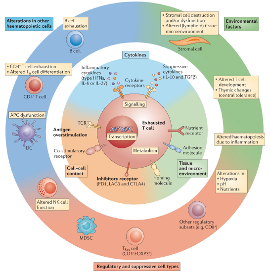 在慢性感染或癌症中,细胞内部及外部信号都会影响T细胞的分化并促进T细胞的耗竭。