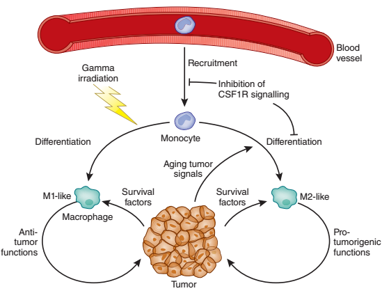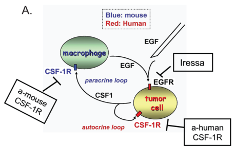 根据以往的研究证据表明M2型肿瘤相关巨噬细胞可主要通过两种机制促进肿瘤细胞侵袭和脉管内渗。第一种机制是巨噬细胞通过双向旁分泌信号辅助肿瘤细胞向血管迁移,称为巨噬细胞-肿瘤细胞反馈回路。如TAMs表达单核细胞集落刺激因子受体(M-CSFR,也称为CSF-1R或cFMS),其结合由肿瘤细胞分泌的单核细胞集落刺激因子(M-CSF,也称为CSF-1),被刺激的TAMs分泌表皮生长因子(EGF)并激活肿瘤细胞上的EGF受体(EGFR),进而导致两种细胞类型的共同迁移,从而增强肿瘤细胞侵入、渗透进入周围健康的组织。