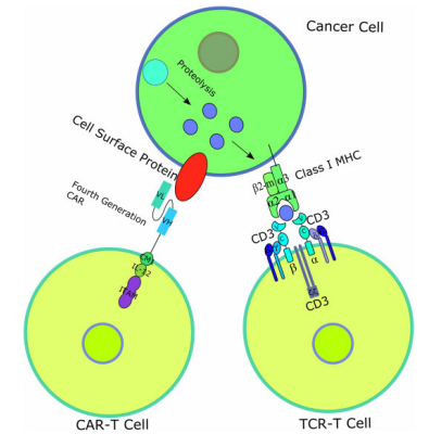 T细胞受体(TCR)嵌合型T细胞技术(TCR-T)转入的是T细胞受体,来自人体T细胞上分离得到的固有分子,包含两条肽链,均为跨膜蛋白,由二硫键相连。每条肽链胞外区各含1个可变(V)区和1个恒定(C)区,V区是TCR识别pMHC的功能区。胞质区很短,不具备转导活化信号的功能。跨膜区通过盐桥与CD3分子的跨膜区连接形成TCR-CD3复合体,转导活化信号至T细胞内。