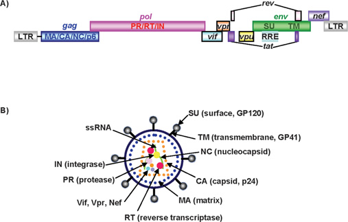HIV-1 基因组含有9个开放阅读框,编码至少15种与感染周期有关的不同蛋白质,包括结构蛋白和调节蛋白。另外,在病毒生命周期的各个阶段还需要一些顺式作用元件,包括长末端重复序列(LTRs),TAT 激活区(TAR),剪接供体和受体位点,包装和二聚化信号(Ψ),Rev 反应元件(RRE)以及中央和末端多聚嘌呤区(PPT)[1]。