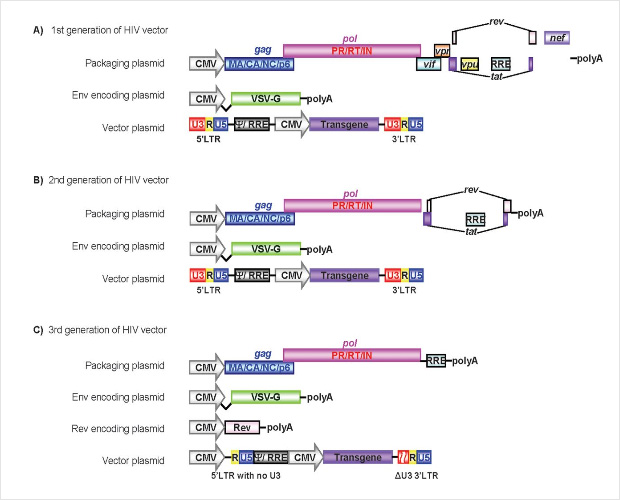 第一代基于 HIV-1 的慢病毒载体将载体组分分成三个质粒以增加安全性:(i)包装质粒;(ii)编码病毒糖蛋白的 Env 质粒(包膜质粒); 和(iii)转移质粒[2]。利用基因工程手段特异性删除包装质粒的包装信号或 LTRs 以避免它们传输到载体颗粒,并减少载体制剂中复制型感染性慢病毒(RCLs)的产生[2]。