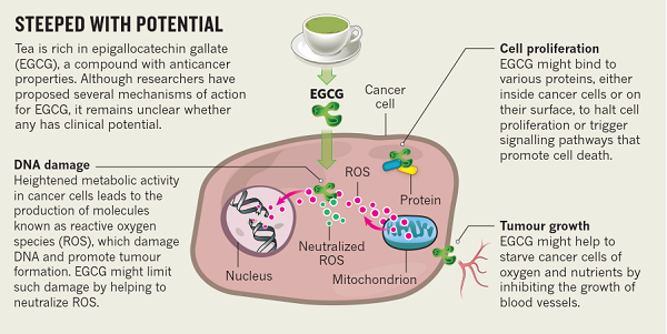 在当前研究中,茶的化学成分中被认为最有药用价值的是表没食子儿茶素没食子酸酯(EGCG),EGCG是茶多酚的主体成分儿茶素的单体之一,一杯绿茶中的儿茶素通常包含60–65%的EGCG。实验室研究中EGCG对培养的癌细胞和小鼠肿瘤模型都具有非常显著的药理效果。大量临床前研究已经清楚地证明了EGCG的潜在治疗价值。2009 年杨中枢发表的一篇综述发现,在已发表的 147 项涉及茶或茶萃取物的动物研究中,有 133 项证明了茶或茶萃取物对于多种癌症具有有效预防或生长抑制作用。其中需要特别指出的是,EGCG在细胞培养物中会独立产生强效作用,但是仅有EGCG时在体内环境中并不会发生作用。EGCG具体通过什么方式使其具有抗癌效果还不确定,研究人员们提出EGCG的多种可能的作用机制:
