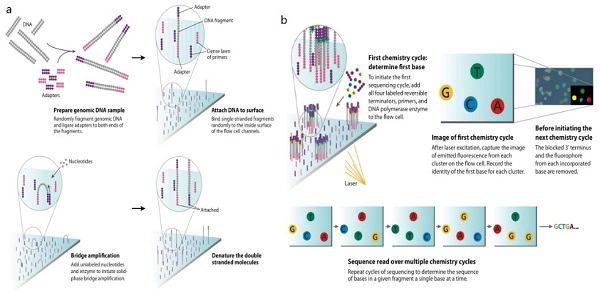 最新的DNA测序技术统称为下一代测序(NGS),也称高通量测序。有许多使用不同技术的新一代测序方法,但大多数具有相同的特点。相比传统的Sanger测序,NGS支持多个测序反应同时进行,测序反应体系小,可以在芯片上一次完成多组反应等优点。但是,其测序长度相对要短一些,通常为50-700个碱基。