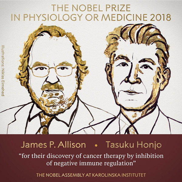 图1. 2018年诺贝尔生理学或医学奖授予两位免疫学家:美国的詹姆斯·艾利森(James P Allison)与日本的庶佑(Tasuku Honjo),以表彰他们“发现负性免疫调节治疗癌症的疗法方面的贡献”。这一发现为癌症治疗开创了全新的免疫治疗思路——释放免疫系统自身的能力来攻击肿瘤。(来源:The official website of the Nobel Prize)