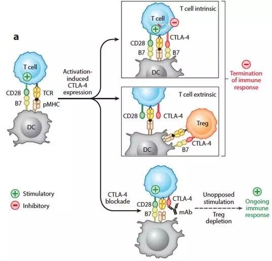 当T细胞被激活后,CTLA-4的表达上调,并与共刺激分子CD28竞争性结合B7配体,抑制了共刺激信号,从而抑制了机体的免疫反应(图中用Inhibitory表示);如果用CTLA-4的抗体进行封闭,可阻止抑制信号的产生,释放T细胞的活性,从而增强免疫反应(图中用Stimulatory表示)。