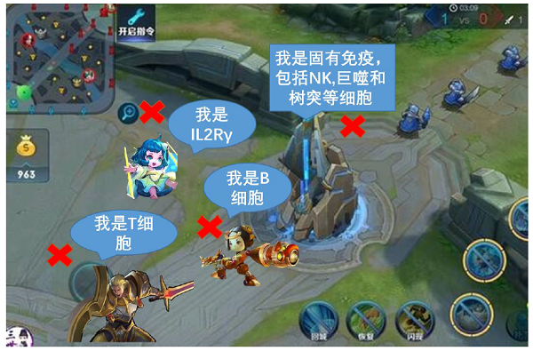 图3 NSG小鼠模型。图中可以看到NSG小鼠模型体内作为特应性免疫的 “射手”B细胞和“战士”T细胞都被秒掉了,作为辅助位的IL2Rγ也没了,固有免疫防御塔也快被推了。