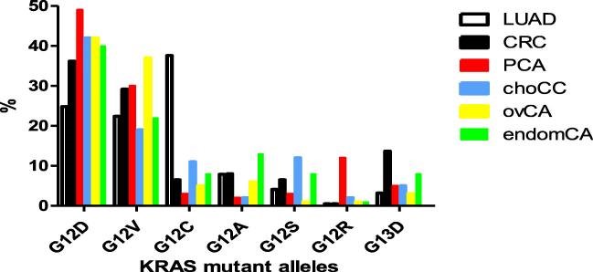 KRAS外显子2突变等位基因在各种癌症中的发生率(Timar J and Kashofer K,2020)数据以% 表示,LUAD肺腺癌,n = 579;CRC结直肠癌,n = 560;PCA胰腺癌,n = 2661;choCA胆管癌,n = 255;ovVA卵巢癌,n = 410;endomCA 子宫内膜癌,n = 306。