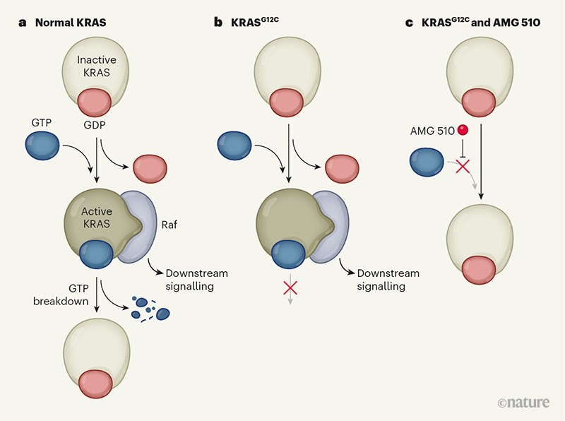 KRAS G12C突变体有一个从正常的甘氨酸(G)突变成半胱氨酸(C)的改变,该残基已被用于设计有希望的共价抑制剂。2021年5月,美国FDA批准新型抗癌药Sotorasib(AMG510)上市,这是全球首个上市的KRAS靶向药,用于治疗既往至少接受过一次系统治疗的携带KRAS G12C突变的晚期或转移性非小细胞肺癌患者,Sotorasib(AMG510)作为KRAS G12C的共价抑制剂,具有高选择性和不可逆的特点,可以将KRAS G12C 捕获在非活性 GDP 结合状态(下图),临床数据表明,Sotorasib治疗对具有 KRAS G12C 突变且毒性可耐受的非小细胞肺癌患者具有显着疗效,可代表一种新型靶向治疗,但还需要进一步的研究来确定Sotorasib 的耐药机制、疗效和安全性。此外,KRAS信号传导的上游信号节点或下游传导途径的共抑制,或者联合细胞周期检查点共抑制,这些协同作用也在临床试验中进行测试。
