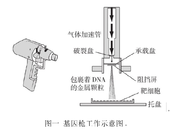 先将外源基因如DNA分子吸附于直径约为4 μM的钨粒或者金粒上,就像是组成了“子弹”。气体基因枪利用压缩气体(氦或氮等气体)作为动力驱动,将包裹着DNA的金属微粒子弹加速到一个很高的速度后,穿透细胞壁、细胞膜、细胞质等结构到达细胞核,完成外源基因的导入[1]。基因枪轰击可能对细胞造成较大的伤害,因此很少细胞符合基因枪法的要求。目前这种方法常用于植物细胞的基因转导,转化率高且重复性较好。