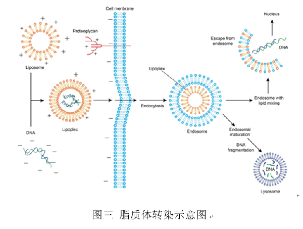 细胞膜是由磷脂双分子组成的,想跟它打好关系最好的办法就是融入它。因此便有了脂质体转染法。脂质体也被叫做人工细胞膜,具有磷脂双分子层。表面带正电荷的脂质体与DNA(或RNA)分子的磷酸根通过静电作用结合,脂质体将分子包裹在内,细胞膜的表面也是带负电荷的,因此可以吸附脂质体,最后融合通过内吞的方式将分子带入细胞内。这种方法的基因转导率高,而且不仅可以转导小片段基因分子,对于大片段的基因分子也有很高的转导效率,因此在科研研究中得到了非常广泛的应用[7]。但是脂质体转染法的成本较高,具有一定的细胞毒性,不适用于大剂量的研究。
