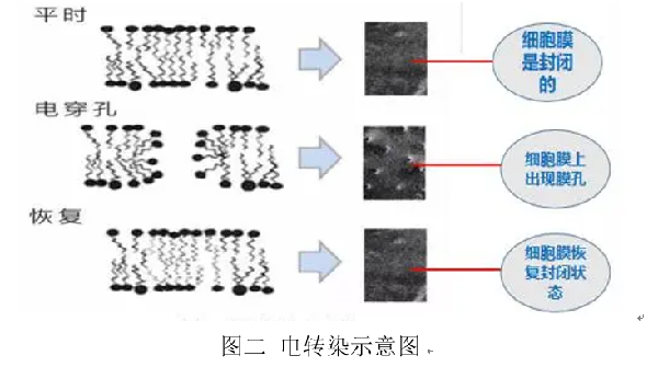 电激即细胞电转染,也叫做细胞电穿孔,是通过外部瞬时、高强度的电场作用,使细胞膜具有一定的通透性,并在电脉冲的作用下形成可逆性的穿孔,使得外源基因可以进入。但基因并不是可以直接进入细胞内的。细胞的细胞膜-细胞质-细胞核在电场中就相当于是串联电路,细胞膜的阻力比较大,在电场中的分压就比较大,细胞质的电阻较小则分得的电压也很小,因此电场的作用只让外源基因停留在细胞膜附近。接着细胞本身的机制可以让这些外源基因慢速扩散进入细胞内。能承受电转能量的细胞,细胞膜承受了大部分的电压,其细胞核承担的电压微乎其微,因此电转不会造成对细胞原本内部基因的毒性[2]。电转的方法可以瞬时和稳定地表达外源基因,因此常用于科研领域的新药开发、癌症研究、免疫学研究等。