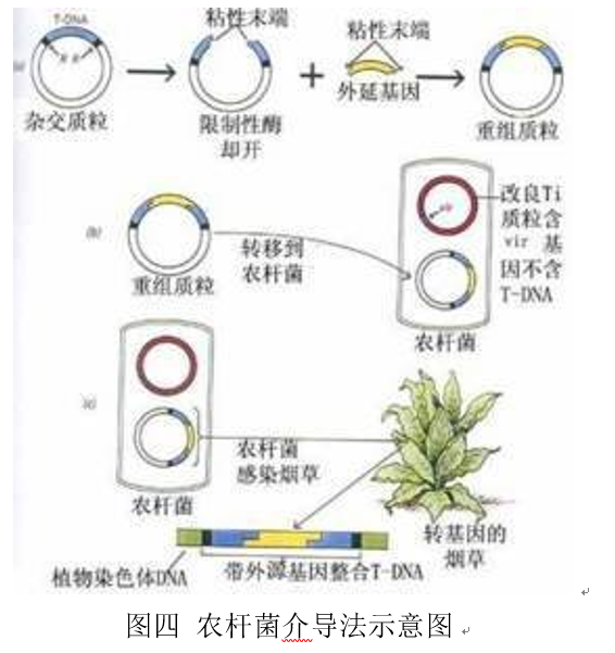 农杆菌是一类革兰氏阴性的细菌。农杆菌中的根癌农杆菌上有一种可以使植物产生肿瘤的质粒,叫做Ti质粒(Tumor inducing plasmid)。Ti质粒上有一小段可以进入植物细胞内部的序列(T-DNA,Transfer DNA)。T-DNA可以插入到植物细胞的基因中,因此研究者则通过改造T-DNA,将外源基因插入到T-DNA中,然后通过农杆菌侵染植物细胞便可以获得转基因植物。受感染的植物细胞需为受伤的双子叶植物细胞,其会释放一些生物信号,这些信号吸引农杆菌靠近,吸附于植物细胞表面。随后农杆菌上T-DNA的毒粒基因被激活表达,帮助引导DNA穿过农杆菌的内外膜以及植物细胞的细胞壁、内外膜和核膜,而农杆菌并不会进入细胞[8]。农杆菌介导是天然的植物遗传转化系统,在转基因植物的研究中受到了广泛的青睐。