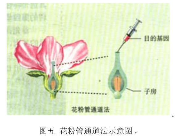 植物细胞在开花授粉后,会形成花粉管,花粉管伸长后借助助细胞进入胚囊中。人工将外源基因借助花粉管导入胚囊中,外源基因进一步整合到早期还没有形成细胞壁的合子中,形成有外源基因的胚,最后经过培养以及筛选得到目的产物。花粉管通道法不用依赖于植物细胞组织培养,可以直接得到转基因的种子。