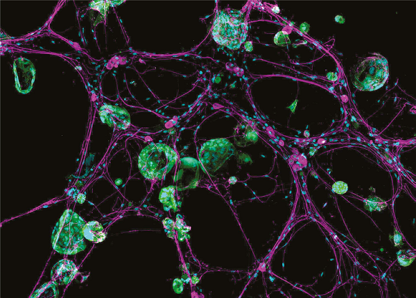 三维模型系统展示神经细胞(红色)与癌细胞(绿色)之间的相互作用