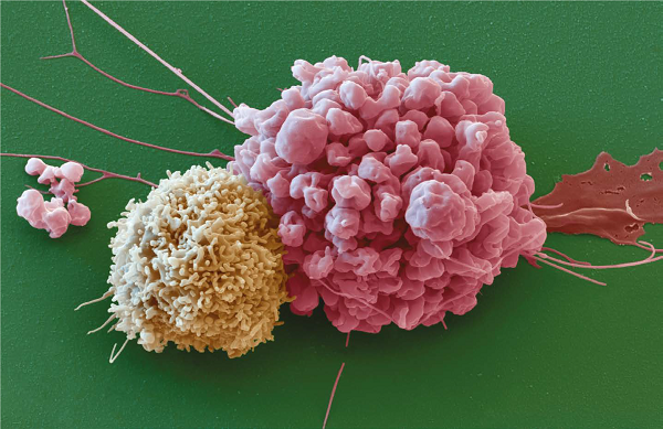一个免疫细胞(左)紧挨一个癌细胞(脑室管膜细胞瘤)