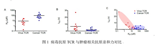 然而,人体内自然形成TCR的亲和力普遍偏低,这与TCR本身参与的免疫反应直接相关。TAA/CT抗原因其本身就是人体正常细胞中存在的蛋白,所以针对这类抗原的高亲和力TCR在产生初期,就经过了胸腺负筛选而基本被淘汰。但是,人体的胸腺随着年龄有一个发育和退化过程,胸腺在青春期以前具有产生T细胞的作用,能够参与机体的细胞免疫和体液免疫,提高机体免疫力,而当进入青春期以后,胸腺逐渐退化,一般到14-15岁的时候胸腺基本已经完全退化,所以,在此之后如果感染了肿瘤发生相关的病毒(如HPV, EBV),携带有针对这些抗原TCR的T细胞则有可能逃脱胸腺负筛选机制而保留高亲和力的特异性好的TCR。图1中有病毒抗原TCR与肿瘤相关抗原TCR的亲和力对比,明显病毒抗原的TCR亲和力普遍更高[1]。从这个角度上讲,做病毒抗原TCR产品,是门槛相对较低的。肿瘤新生抗原也有类似的考虑。