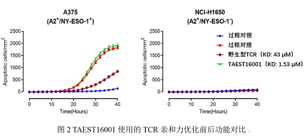 首先来看一个问题,TCR是否做过亲和力优化,对于T细胞杀伤肿瘤细胞效果影响大吗?答案是:非常大!图2中是XlifeSc的产品TAEST16001所使用的TCR在亲和力优化前后肿瘤杀伤效果对比,带有野生TCR的T细胞对癌细胞杀伤效果很差(枣红色线),带有亲和力优化后TCR的T细胞杀伤效果非常好(绿色线),对比十分明显[2]。