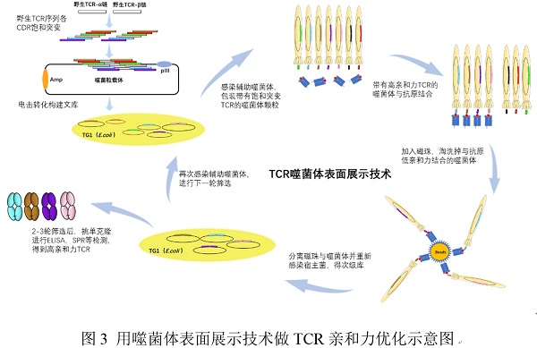 野生型TCR与目标抗原的亲和力大部分较低(几十至几百µM),这使得我们需要将野生型TCR进行亲和力优化以满足TCR-T/TCR蛋白药需求(TCR-T要求KD介于1.0E-05M至1.0E-07M为佳,TCR蛋白药则要求达到1.0E-10M以上)。一个TCR蛋白与其目标抗原直接接触的结构部分是CDR区,二者的亲和力也基本是由CDR区决定,故我们的做法是将一个TCR的CDR区分别进行饱和NNK突变建库,再以噬菌体表面展示技术进行针对目标抗原的亲和力优化筛选,通过竞争性ELISA和高通量SPR等手段对筛选后的克隆进行数据检测并做序列分析,得到高亲和力突变体,然后将这些突变克隆制备TCR异质二聚体蛋白,并用SPR相关技术仪器(如BIAcore)检测其针对目标抗原的精确亲和力,从中挑选亲和力合适的突变进行后续细胞功能检测(图3)。