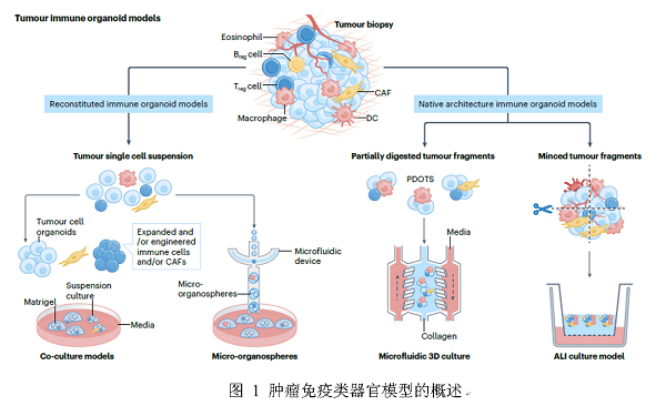 类器官是干细胞衍生的三维培养体系,能再现器官结构与功能,可从多种肿瘤及正常组织高效构建,突破传统静态样本局限,完整保留肿瘤异质性与患者间差异。患者来源的肿瘤类器官(PDOs)支持动态研究,较二维细胞系和PDX模型更具优势。由于可从正常及病变组织快速制备,且美国典型培养物保藏中心(ATCC)主办的人类癌症模型计划(Human Cancer Models Initiative)等平台提供现成资源,此类浸没式类器官已获得广泛应用。尽管这类肿瘤类器官已推动多项重要发现,但传统肿瘤类器官仅含恶性细胞,其缺乏基质成分(尤其是免疫细胞)的特性,可能影响基于免疫治疗或非免疫治疗研究的准确性。构建整合肿瘤与TME组分的新型类器官系统,可能满足全面模拟癌症生物学特征及治疗响应机制的需求。