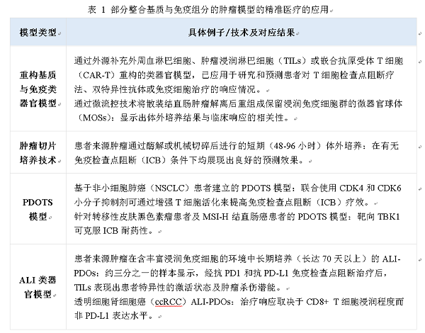 此类系统性模型存在一定局限:源自空间异质性显著肿瘤的类器官存在组内差异;多细胞类型共存及空间结构完整性需求的遗传工程改造复杂化;物理可及性限制可能需要开发原位细胞特异性递送技术。此外,体外观察到的免疫治疗响应需与患者预后进行前瞻性关联验证,这一环节在初期概念验证研究中尚未完善。总体说来,天然类器官技术主要是能保存原始肿瘤的基质与免疫组分,还可维持对肿瘤-TME互作至关重要的原生空间关系(图1),对靶向这类特征的免疫治疗有很大的临床转化潜力。