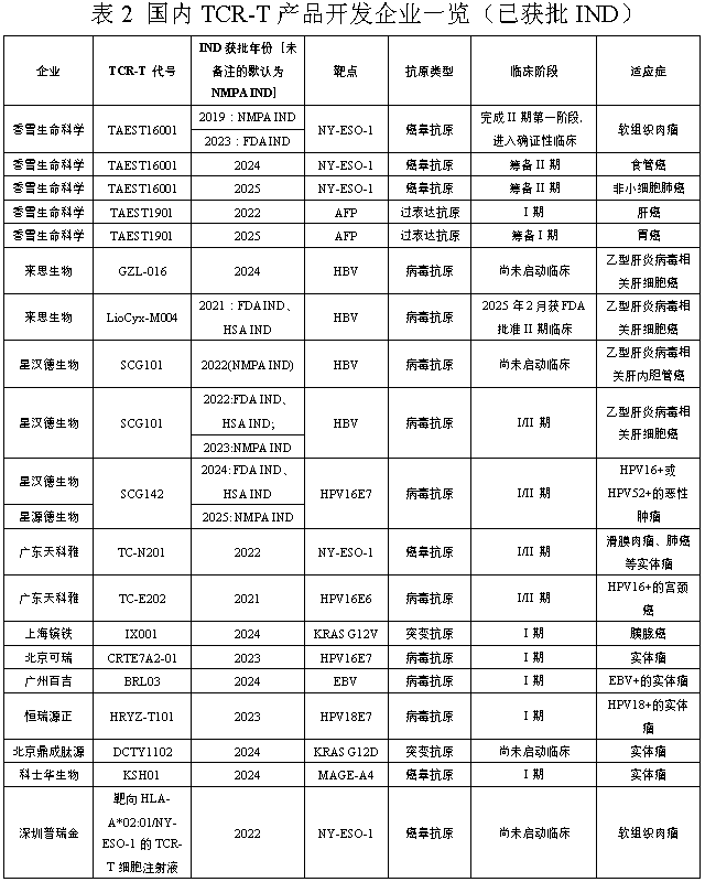 中国TCR-T领域的产品开发起步晚于欧美,但发展却十分迅速,已有众多布局,目前已有超过十家公司的产品进入不同阶段的临床研究(详见表2)。其中,香雪生命科学技术(广东)有限公司(下简称香雪生命科学)在该领域一直处于国内头部位置,目前香雪生命科学已有两个在研产品获国家CDE批准进入临床,其中TAEST16001是中国首个获得IND批件进入临床的TCR-T细胞治疗产品,并于2024年被CDE列入突破性治疗名单,目前已进入确证性临床阶段。香雪生命科学有一支经验丰富,严谨扎实的研发团队,拥有自主知识产权的TCR产品开发核心技术,已搭建完整的TCR-T产品研发技术体系和生产制备体系,其中TCR-T产品研发技术体系包含:抗原肽发现平台,TCR亲和力优化平台,TCR-T全流程开发平台;TCR-T生产制备体系包含:自动化细胞生产平台,质控平台。公司具有TCR-T细胞产品全链条的创新研发生产线,其TCR-T产品布局广泛,靶点丰富,涉及CT抗原,新生抗原,病毒抗原等几乎所有与肿瘤相关的特异性抗原,涵盖A0201,A1101及A2402等多个以中国人群居多的HLA基因型,适应症覆盖多种临床难治的实体瘤。香雪生命科学的发展历程事实上正是近些年中国免疫治疗领域爆发式成长的缩影。总体上看,国内TCR-T免疫治疗领域,正处于百家争鸣的时代,已具备与欧美先驱竞争的实力,谁可以在这个时代掌握核心技术,研发出过硬的产品,谁就可以在时代的角逐中占得先机。