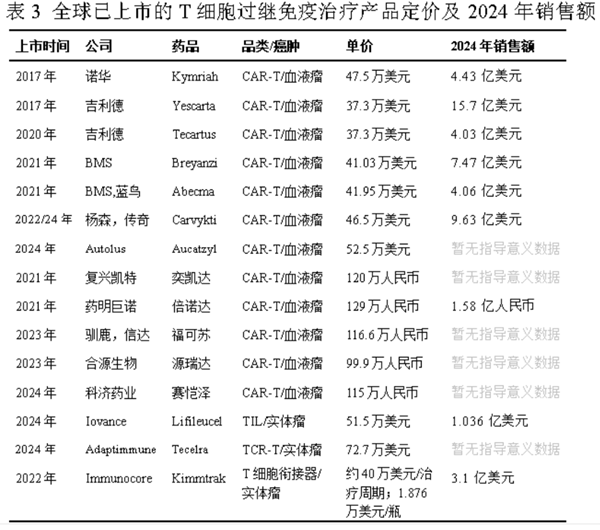 知名市场研究和咨询机构Nova One Advisor最新数据显示,2023年全球T细胞相关疗法市场规模为38.5亿美元,预计到2033年将达到约796.2亿美元,2024-2033年的复合年增长率为35.38%[7]。这其中, CAR-T产品的贡献非常大的,欧美上市的7款CAR-T产品定价都在40万美元左右,虽定价较高,但欧美人群支付力相对较强,所以每款产品每年的营销额都可达到数亿美元;国内上市的CAR-T产品相较欧美时间较短,但定价基本都在100万人民币左右,只有欧美产品定价的约40%,价格优势明显(详见表3)[5] [6]。