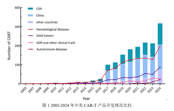 在过去的8年间,中国在T细胞过继免疫治疗行业的投入和临床试验数量上都有着井喷式的增长,这得益于政府的政策利好、充裕的资金投入以及庞大的受试者群体。以T细胞过继免疫治疗的主流产品之一CAR-T为例,数据显示,2024年中国启动的CAR-T临床试验数量已超越美国,成为全球CAR-T研发最活跃的地区(见图1)[4]。