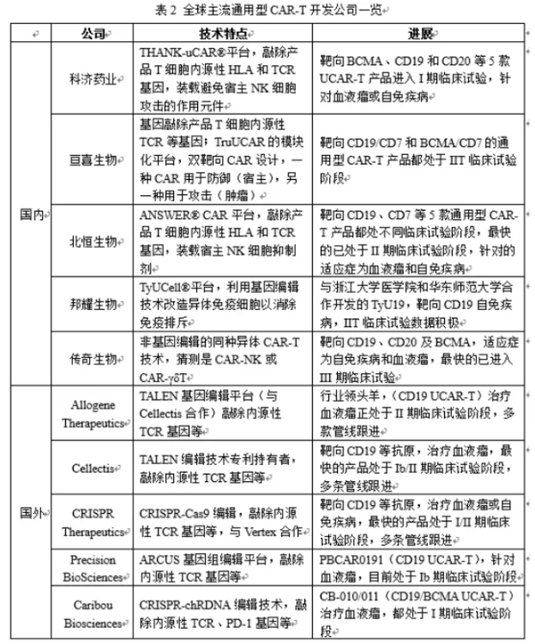 开发通用型CAR-T/TCR-T:通用型CAR-T又称同种异体CAR-T,是从健康供者体内采集T细胞,并在体外通过基因工程技术改造,敲除其内源性的HLA、TCR等会引起排异反应的因素,然后导入目标CAR分子并大规模扩增,制备成现货型的T细胞过继免疫治疗产品。由于其来源于健康供者,不受患者T细胞数量和质量影响,制备成功率高,单批次可满足上百人份的需求,可将生产成本降低约90%。因此近几年,通用型CAR-T在细胞治疗领域掀起了研发热潮(见表2)。当然,通用型CAR-T的开发依然面临诸多挑战需要克服。