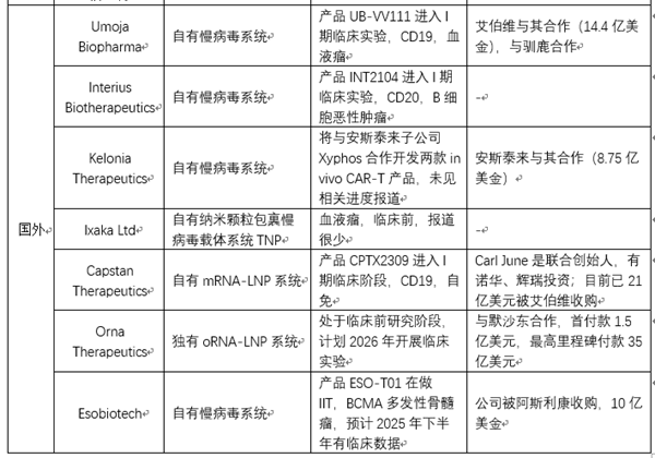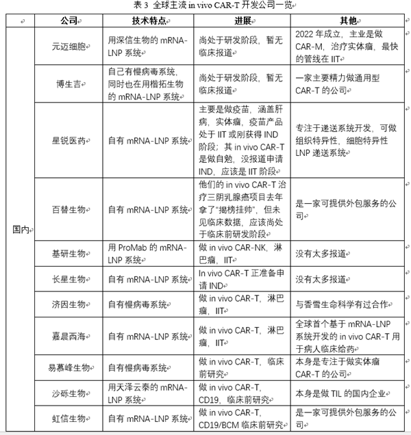 In vivo CAR-T/TCR-T 技术突破:In vivo CAR-T的思路是通过递送系统(如病毒载体或LNP等),将CAR基因或者CAR的mRNA递送到患者体内T细胞上,在患者体内实现CAR分子的表达,将患者体内的T细胞武装成为CAR-T,进而攻击肿瘤细胞,达到治疗效果。In vivo CAR-T通过直接在患者体内递送CAR分子,跳过体外制备环节,生产成本可降至传统CAR-T的10%,极大的提升可及性;同时,传统CAR-T制备需2-3周,患者可能因疾病进展错过最佳治疗时机,In vivo CAR-T无需体外培养,可实现“即用型”治疗,从诊断到治疗的时间大幅缩短,尤其适用于病情进展迅速的患者。基于In vivo CAR-T的这些颠覆性优势,全球各大MNC都在纷纷布局,力求争夺市场先机(见表3)。当然,In vivo CAR-T目前在血液瘤的治疗中取得不错的成果,但如同传统CAR-T一样,其在实体瘤中仍未有令人振奋的突破。鉴于体外TCR-T疗法在实体瘤中已有明确显著的疗效,In vivo TCR-T或许会是未来实体瘤治疗的另一主流发展方向。