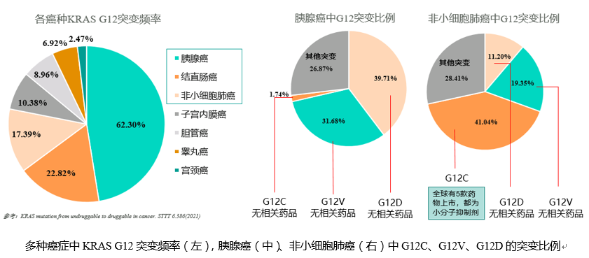 KRAS蛋白是由克里斯汀鼠肉瘤病毒基因(Kirsten rat sarcoma viral oncogene,KRAS)编码的一种小GTP酶,参与细胞的增殖、分化、迁移和凋亡等活动,被认为是调控细胞生命周期的信号开关。然而KRAS基因容易发生突变导致下游信号通路的过度激活,是肿瘤疾病发生发展的重要因素。KRAS突变以单碱基错义突变为主,绝大多数发生在密码子G12、G13或Q61上。KRAS G12突变包括G12C、G12V、G12D、G12A等亚型,不同肿瘤中突变率有差异,以G12C、G12V和G12D突变为主。KRAS突变阳性的癌症中,最主要的三种癌症为胰腺癌、、非小细胞肺癌、结直肠癌。