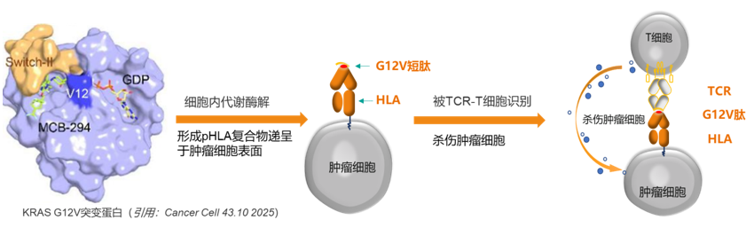 与传统的靶向药开发策略不同,TCR-T疗法不依赖于KRAS蛋白自身的结构,不需要考虑其与GTP高强结合、蛋白结构缺乏药物结合口袋等因素。KRAS突变蛋白(不限于G12)可在肿瘤细胞内正常代谢酶解,形成携带有突变(如G12V)的短肽,这些短肽可被HLA递呈至肿瘤细胞表面,被TCR-T细胞识别,并产生杀伤。
