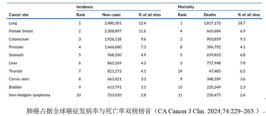 世界卫生组织(WHO)下属国际癌症研究机构(International Agency for Research on Cancer,简称IARC)最新数据显示,肺癌是目前全球发病率和死亡率均排名第一的癌症,已连续十年位居全球癌症死亡率首位。