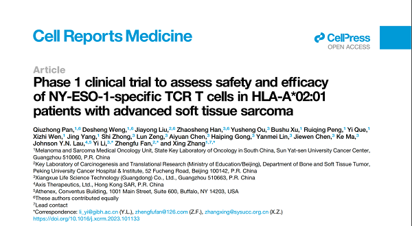 TAEST16001 is a TCR-T cell immunotherapy product independently developed by XlifeSc. The first Phase I clinical trial was a dose-escalation and expansion study of TAEST16001 cells in patients with advanced soft tissue sarcoma who are HLA-A*02:01 positive and express the NY-ESO-1 antigen. The study was led by Professor Zhang Xing from the Sun Yat-sen University Cancer Center and Professor Fan Zhengfu from Beijing Cancer Hospital. The co-first authors of the article are Dr. Qiuzhong and Dr. Weng Desheng from the Sun Yat-sen University Cancer Center, and Professor Liu Jiayong from Beijing Cancer Hospital.
