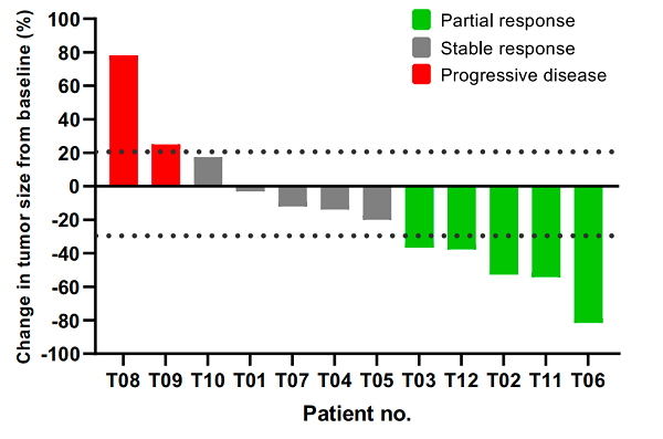 • At initial analysis, 5 of the 12 patients had a partial response, resulting in an ORR of 41.7% [95% CI, 15.2-72.3]; 5 patients (41.7% [95% CI, 15.2-72.3]) had stable disease, leading to a disease control rate of 83.3% [95% CI, 51.6-97.9] (Figure A).